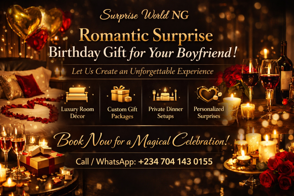 At Surprise World NG, I don’t just create setups—I create unforgettable experiences. If you want a truly stress-free and perfectly executed romantic surprise birthday gift for boyfriend, I can help you bring your vision to life without the hassle.